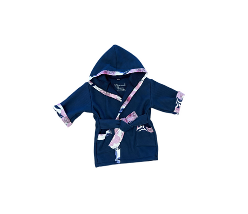 Bath, Beach or Pool Robe in Navy with Boysenberry Floral Trim