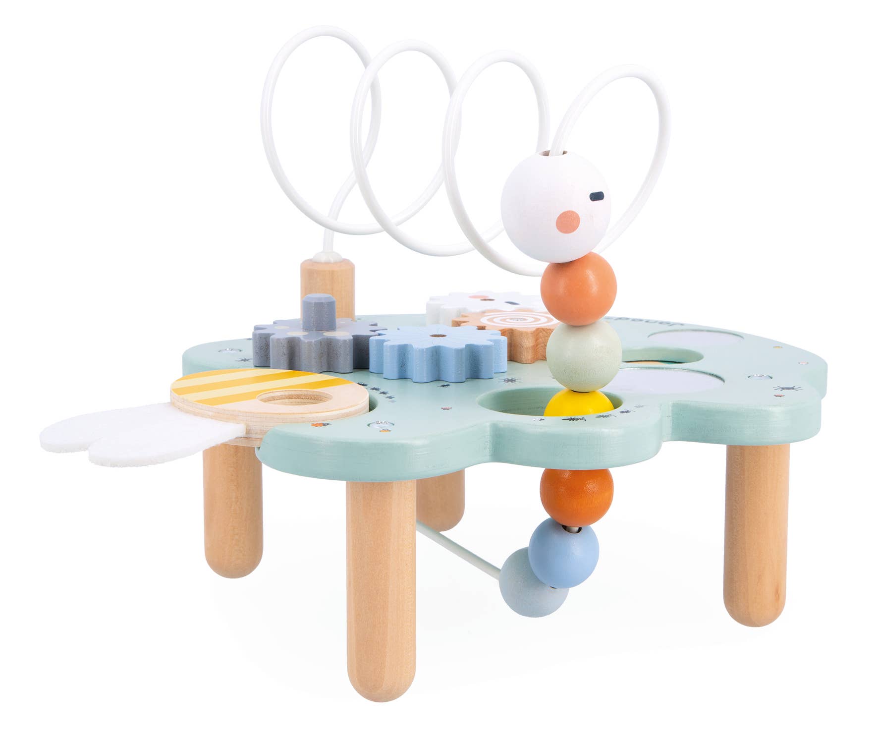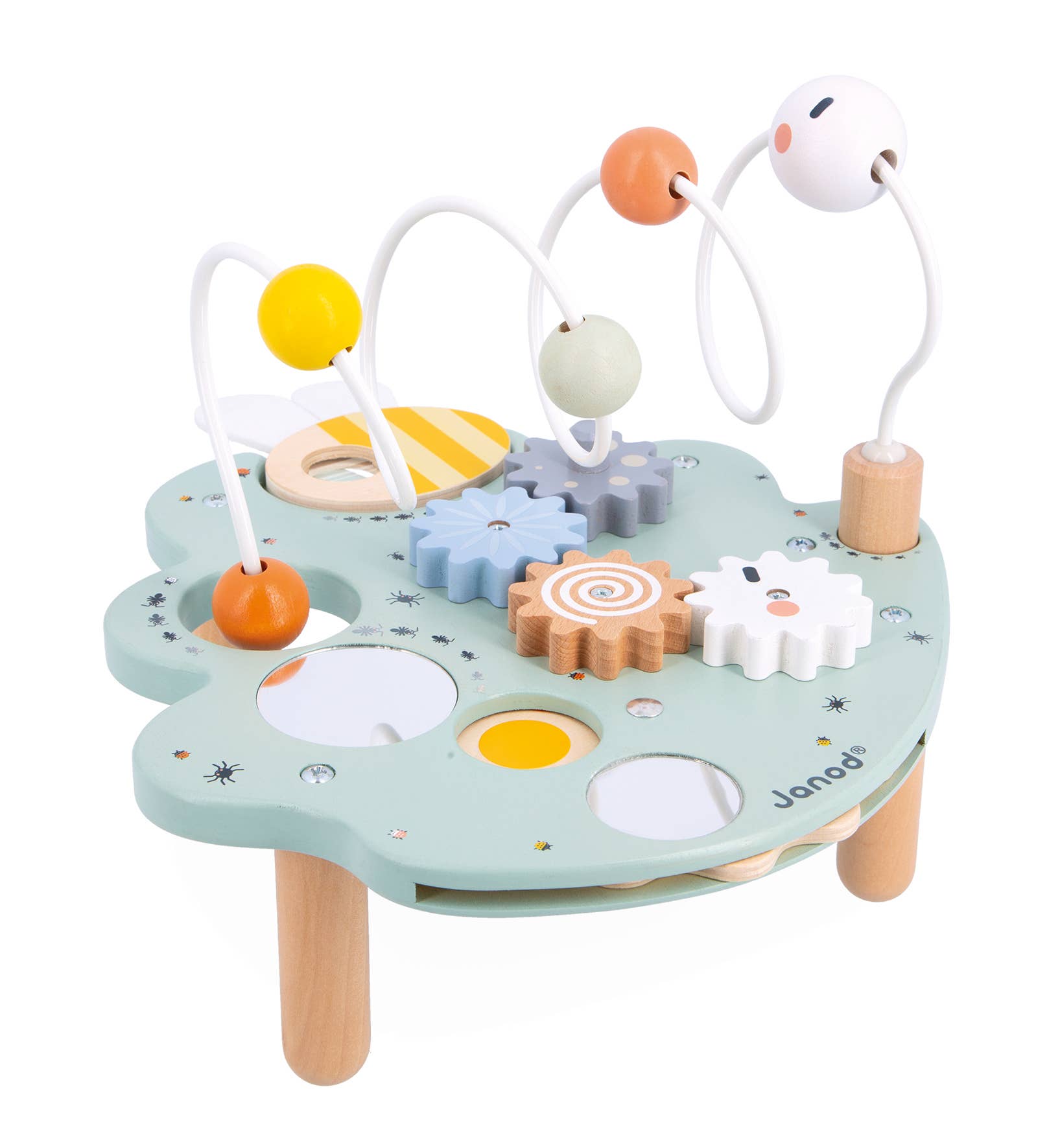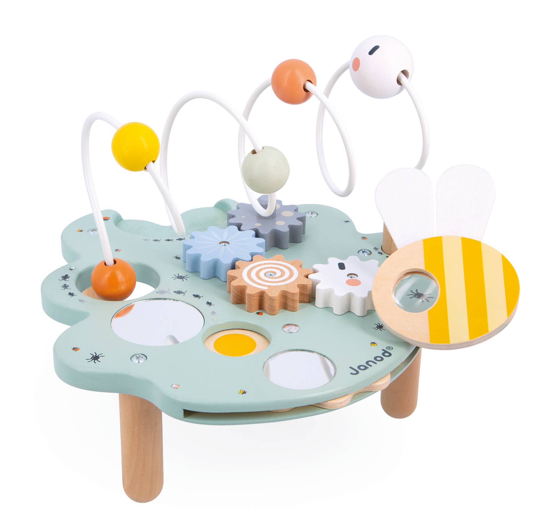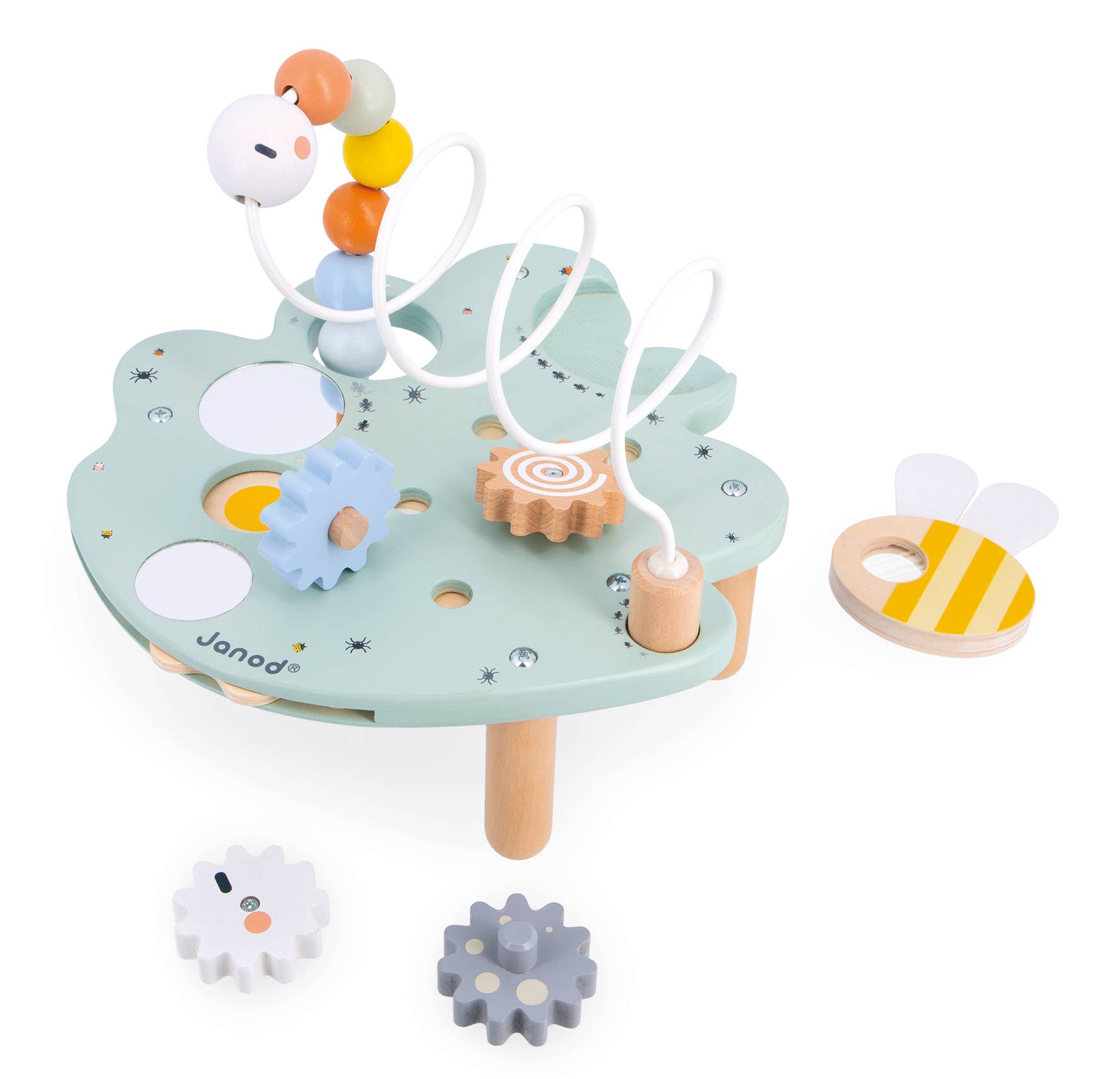 Welcome to Madame Caterpillar’s giant leaf... and I see a greedy little one has already nibbled a piece of it! The full caterpillar can now have fun both above and below the leaf. This leaf offers plenty of activities to keep children occupied: a large looping toy to move the caterpillar around, removable gears, a color wheel, 3 mirrors and a bee-shaped magnifying glass to get a closer look at all the tiny insects hiding on the leaf! The ideal toy for developing children’s fine motor skills, whilst they learn their shapes and colors. Wooden early-learning toy for children aged 18 months and up.